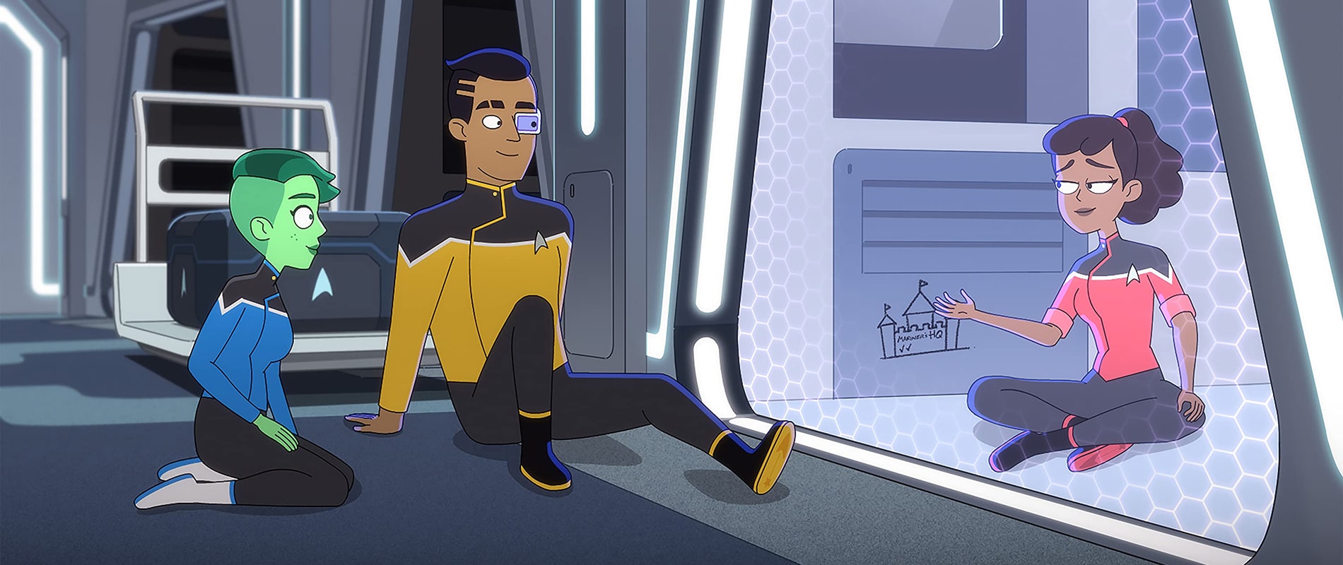 Sadly, the most intriguing part of ‘Strange Energies’ comes right at the end, where we learn what is going on with Boimler (Jack Quaid). His difficulties, and how people react to the minutiae or unexpected side of being below command level shows much more promise than extending this obsession with Mariner’s ‘bro’ persona.